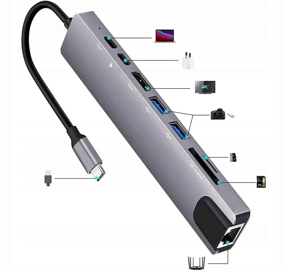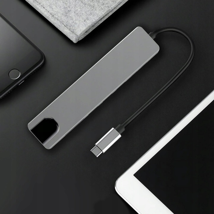 Adaptor Hub USB Type-C 3.1 Multiport 8 in 1 la HDMI 4K, LAN RJ45 Ethernet, 1 x USB Type-C, 2 x USB-A, PD 87W Charging Port, SD/TF Card Reader, Docking Station Laptop Lenovo, Dell, HP, Asus, Acer, Apple MacBook Air/Pro, Chromebook, Tableta, NewEvo®, Gri