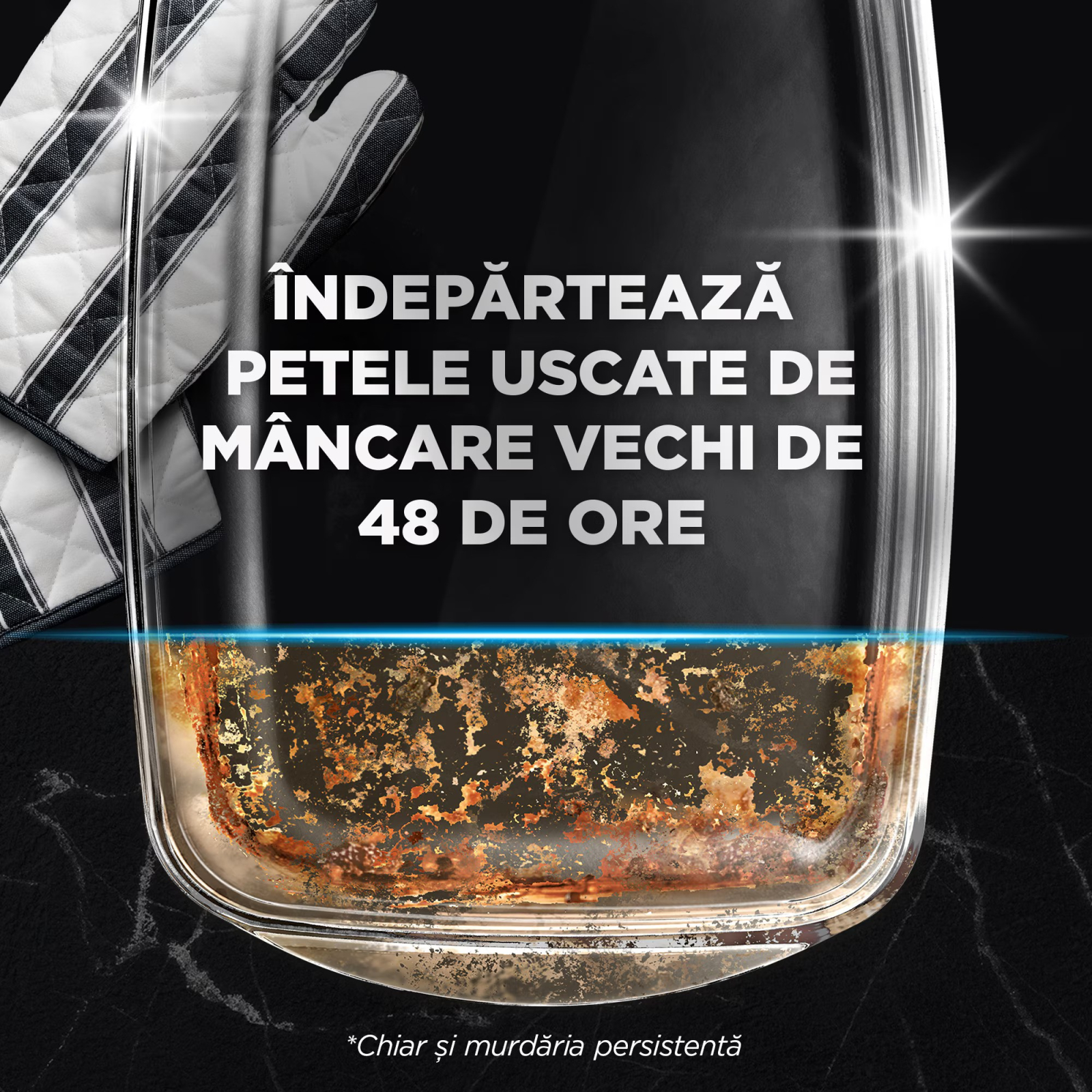Detergentul pentru masina de spalat vase Finish Ultimate asigura curatare absoluta si indeparteaza resturile alimentare intarite de pana la 48 de ore.