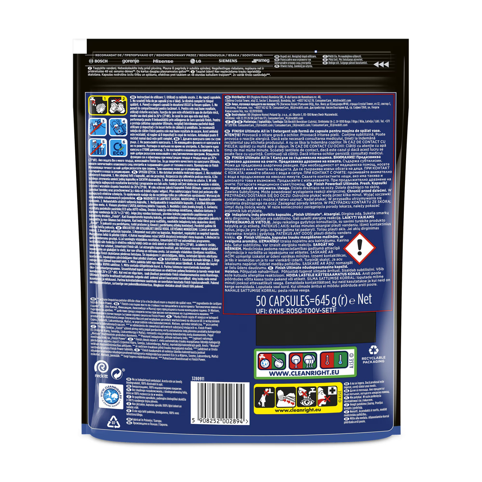 Este un detergent sub formă de capsule pentru mașina de spălat vase, gama Finish Ultimate All in 1, pentru curățarea completă a vaselor într-un singur ciclu.