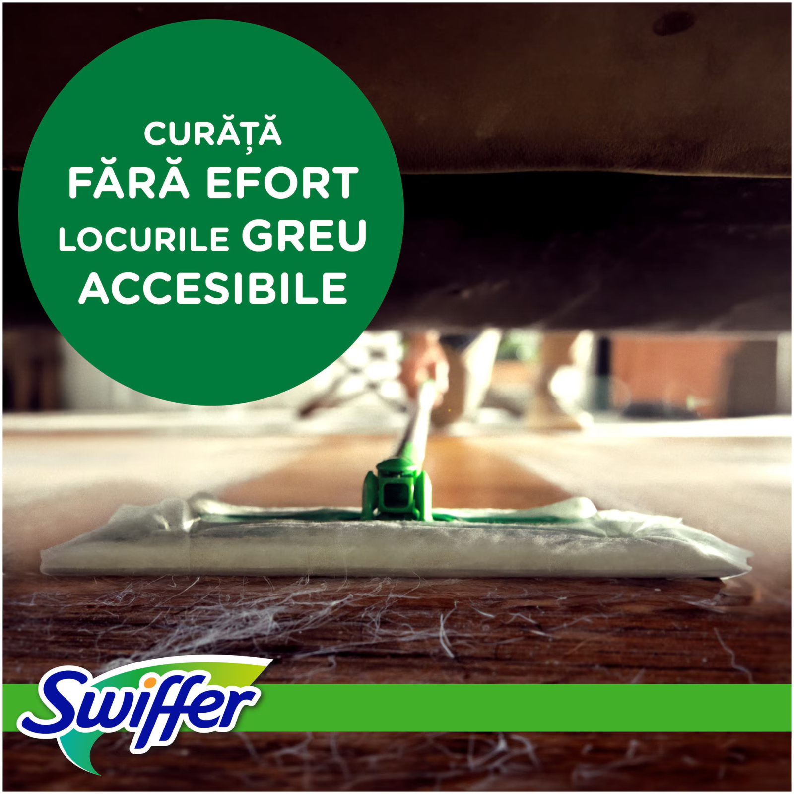 Swiffer Uscat vă permite să readuceți curățenia în casa dvs. în cel mai scurt timp, fără efort și fără zgomot. Este perfect pentru a capta praful fin din colțuri sau locurile greu accesibile, precum sub canapea și sub pat, unde măturile sau aspiratoarele nu pot ajunge întotdeauna.