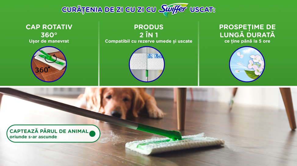 Cu Swiffer Uscat este foarte ușor să curățați părul de animale, deoarece majoritatea animalelor năpârlesc tot timpul. De asemenea, este un bun aliat dacă suferiți de alergii la praf.