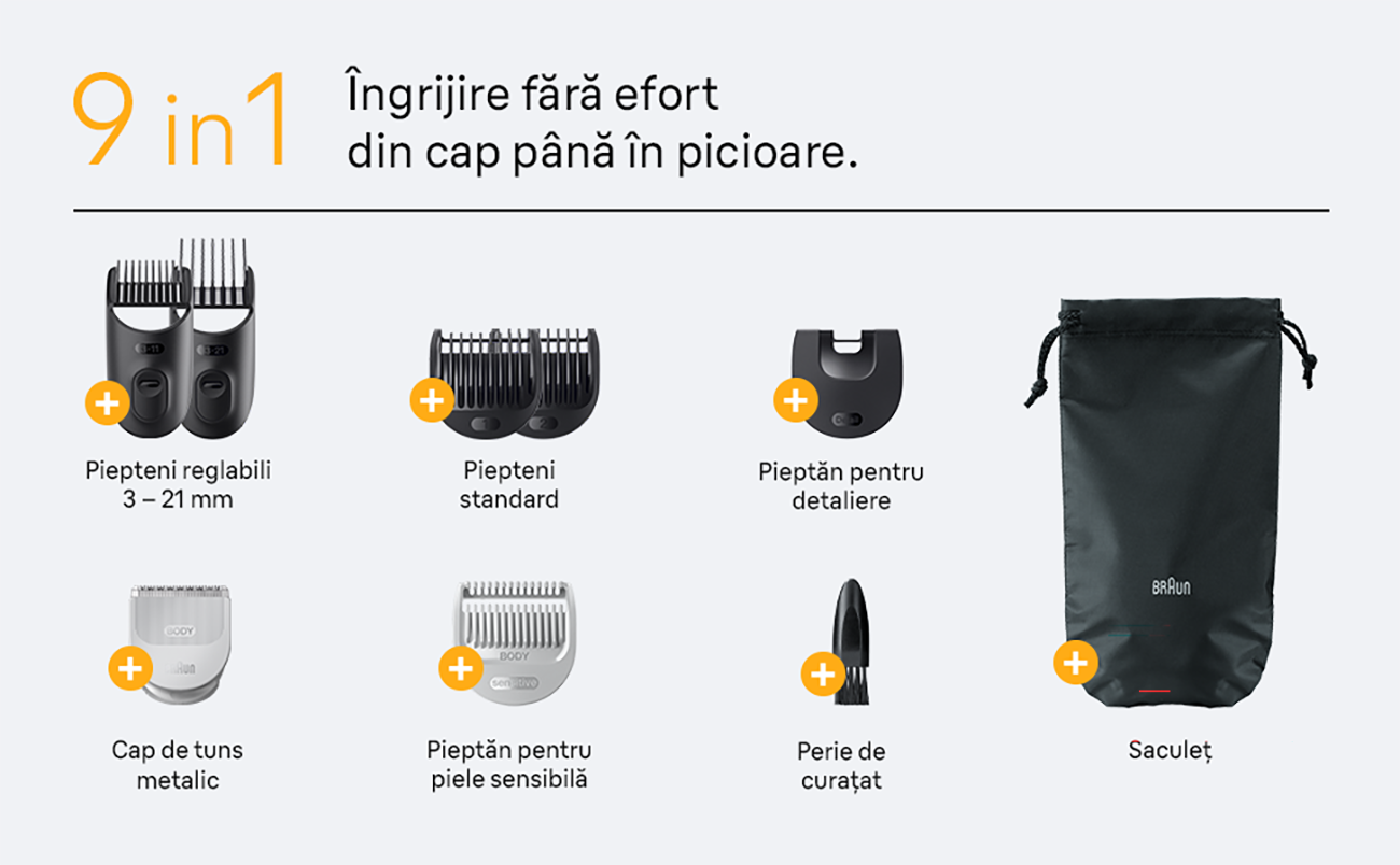 Ingrijire completa, din cap pana in picioare: aparatul multifunctional Braun 9-in1 include accesorii selectate pentru ingrijirea barbii, tunderea parului si indepartarea parului de pe intregul corp. |