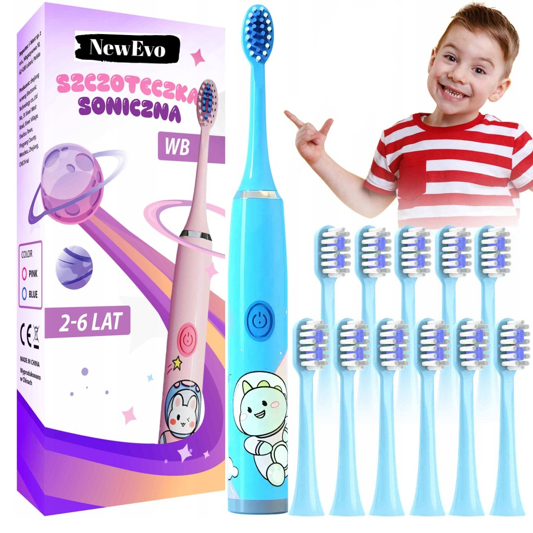 Periuta electrica reincarcabila cu baterie sonica NewEvo® pentru Copii, 32000 miscari/minut, 1 mod de curatatare, 12 capete de periere incluse, smart timer, rezistent la apa IPX6, Albastru