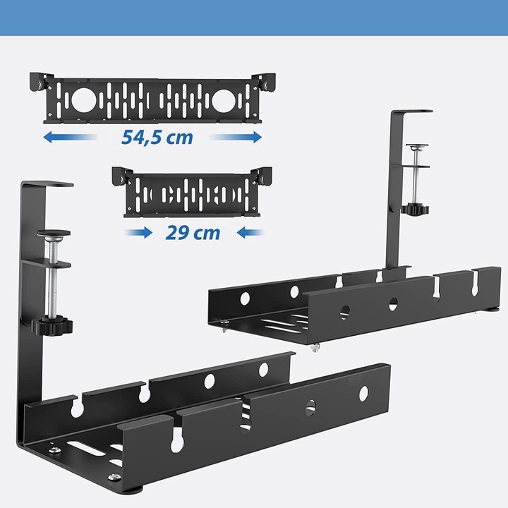 Organizator de cabluri sub birou NewEvo, tava pentru cablu de alimentare, metal robust, potrivit pentru majoritatea birourilor, cu clema, fara gaurire, retractabil, dimensiune extensibila 29-54 cm, Negru
