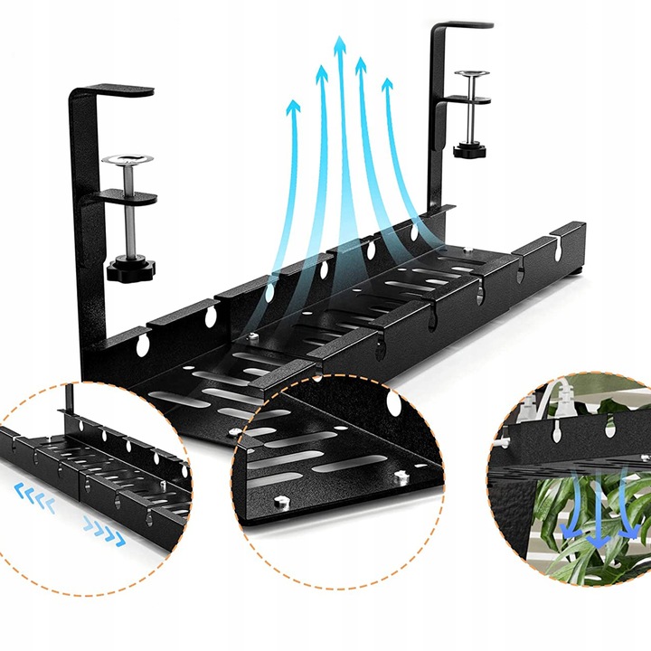 Raftul pentru cabluri este o soluție inovatoare care te va ajuta să păstrezi cablurile în ordine în spațiul tău de birou. Datorită acestuia, poți gestiona eficient cablurile, ascunzându-le și organizându-le într-un mod estetic și funcțional. Fabricat din materiale de cea mai înaltă calitate, acest raft reglabil vă va menține organizați, îmbunătățind în același timp estetica stației dvs. de lucru.