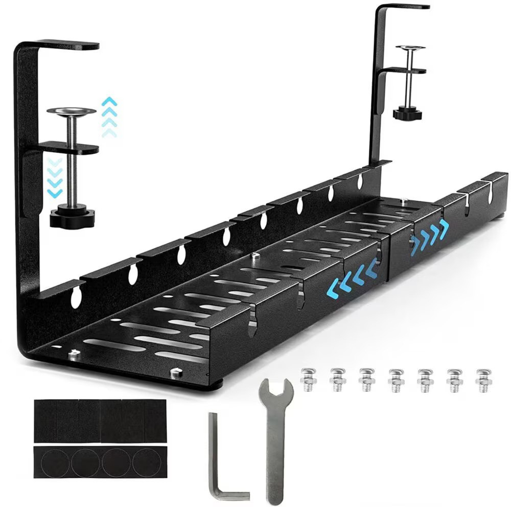 Organizator de cabluri sub birou NewEvo, tava pentru cablu de alimentare, metal robust, potrivit pentru majoritatea birourilor, cu clema, fara gaurire, retractabil, dimensiune extensibila 29-54 cm, Negru