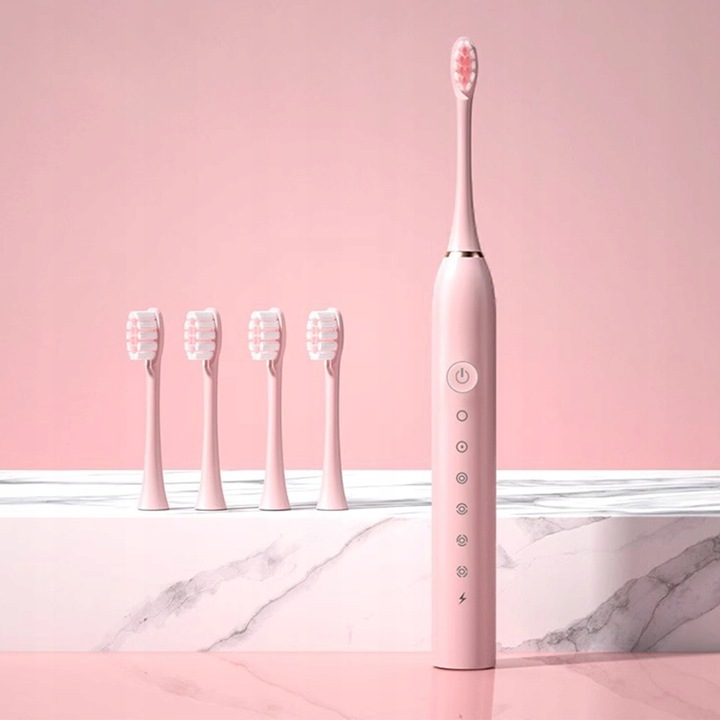 Periuta de dinti electrica reincarcabila sonica, 42.000 miscari/minut, 6 moduri smart de curatare cu temporizator, 4 capete de periuta inlocuibile, IPX 7 Rezistent la apa, cablu USB, baterie 500mAh, statie de incarcare suplimentara, Roz