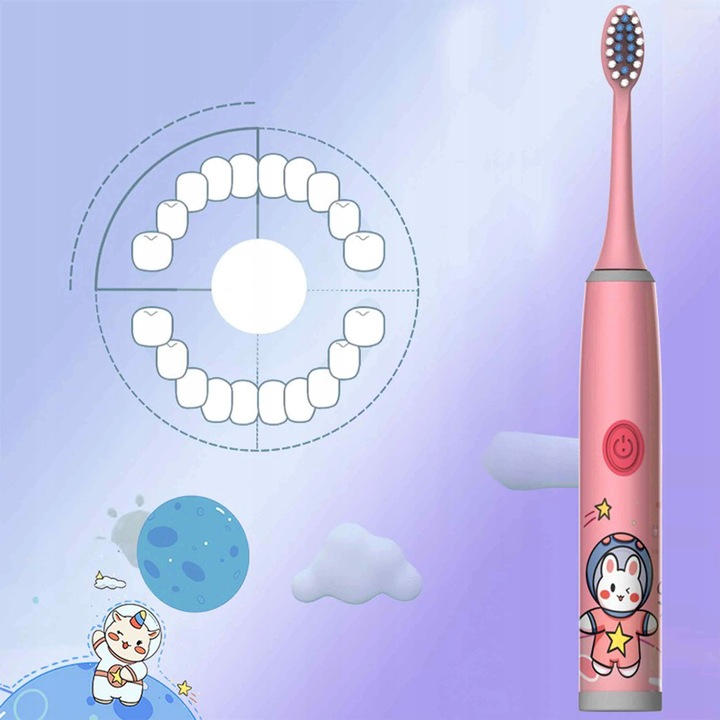 Periuța electrică sonică NewEvo pentru copii este un dispozitiv reîncărcabil care folosește vibrații de înaltă frecvență (32.000 mișcări/minut) pentru o curățare delicată, eficientă și sigură a dinților copiilor.
