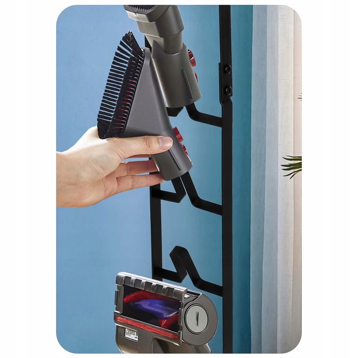 Acest suport vă ajută să vă păstrați casa ordonată. Datorită mânerelor special concepute, toate sfaturile pentru aspiratoare sunt întotdeauna la îndemână.