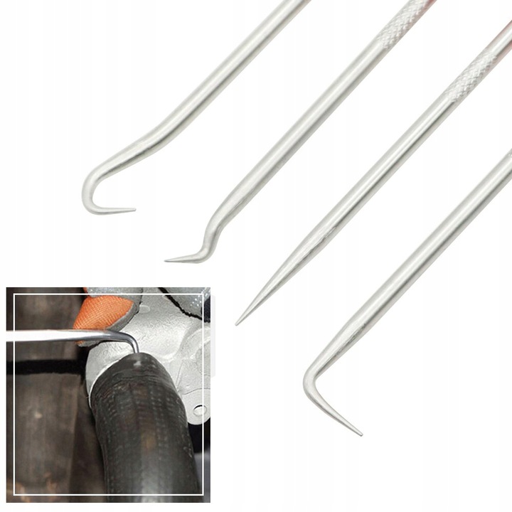 Unelte destinate pentru indepartarea inelelor O, a garniturilor si a tuturor tipurilor de garnituri. Fabricat din otel rezistent la indoire si deformare. Manerele sunt acoperite cu un strat antiderapant care faciliteaza o prindere stabila. Setul include carlige cu capete: unghi drept, unghi 45° / 90°, unghi 45° / 45°, rotunjite si drepte.